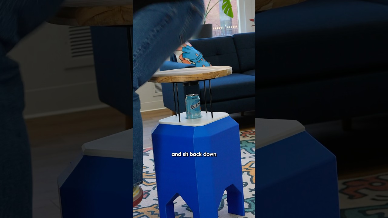 4本のピストンで上昇させ、座るときには真ん中の穴に空き缶を置き、座面の上に座るのみ。