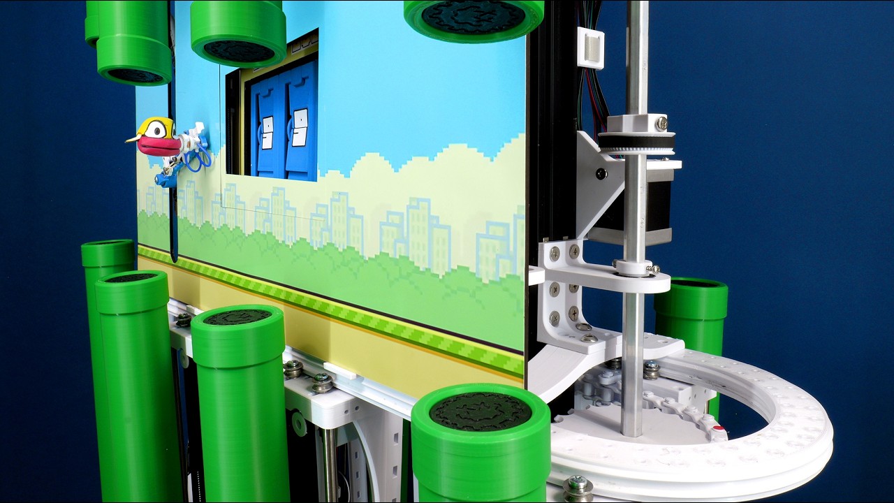 2Dアクションゲーム「Flappy Bird」を機械仕掛けで作ってみた動画。
