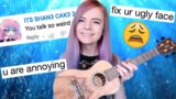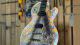 かわいらしいギターを弾こうと案分につなぎスイッチを入れる男性。