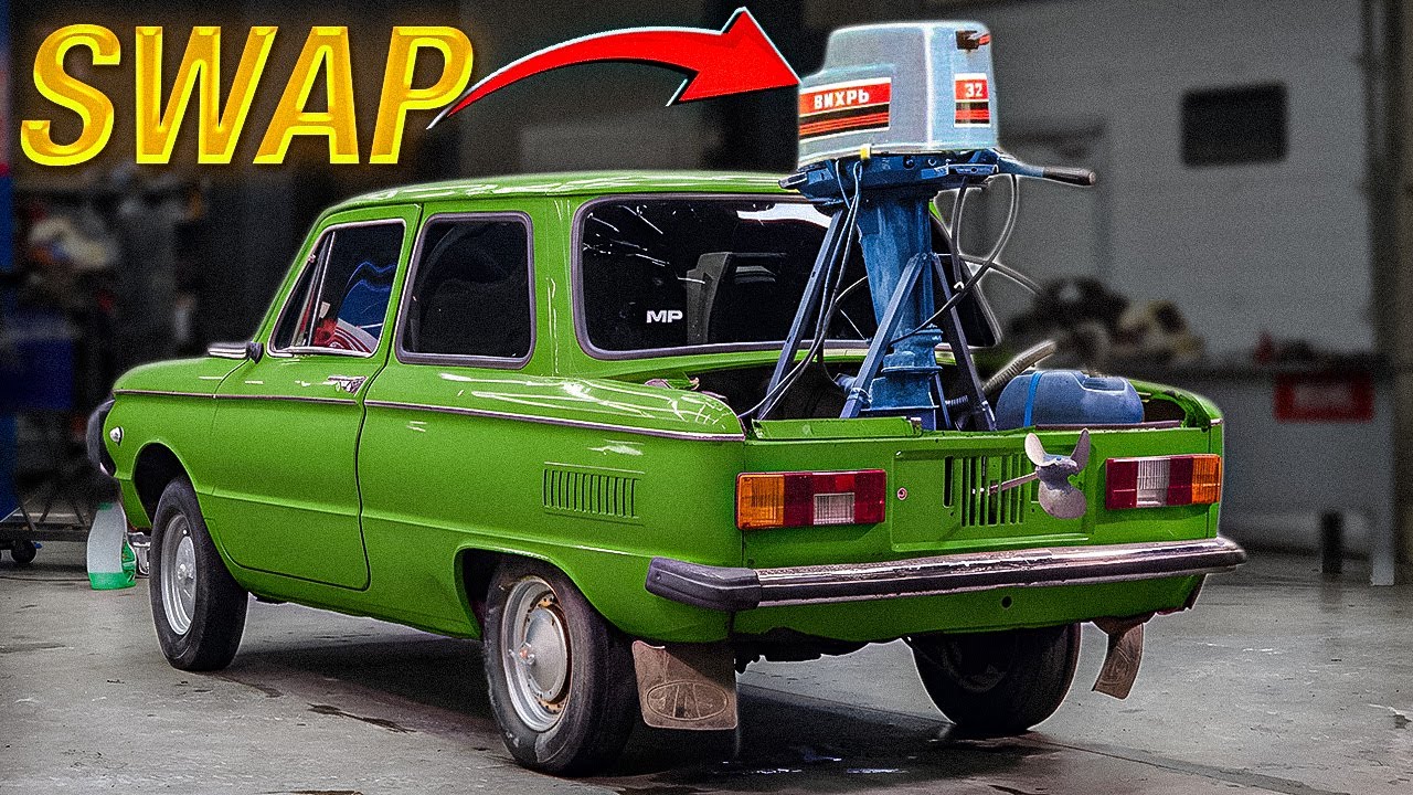 ボートの船外機のモーターを車に取り付けてみた動画。