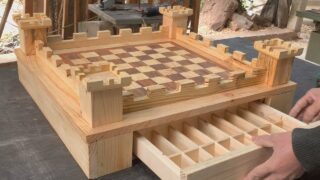廃材を材料にして作った木製チェスボードの制作動画。材料となったのは敷地内に積んである木の廃材。その材料を使いボードの装飾を含め作って行きます。駒は既製品のものを使用されています。デザインがカッコイイですね。